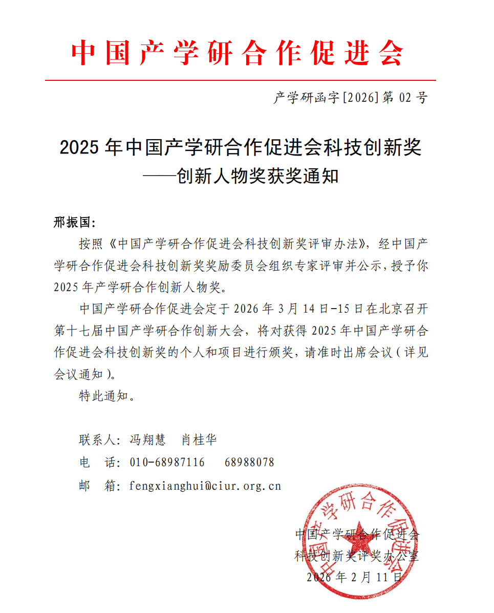 经申报、审核、答辩和评审,授予邢振国2025年产学研合作创新人物奖。
