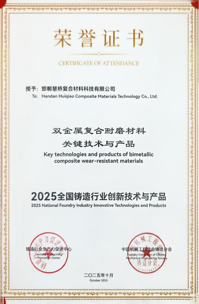 2025 年 10 月 25-28 日在西安举办的第 17 届亚洲铸造会议暨 2025 中国铸造活动周期间,“2024-2025 年度全国铸造行业创新技术与产品”评选活动同期举行。经形式审查、现场答辩和专家评审,共有10项技术和产品入选2024-2025 年度全国铸造行业创新技术与产品,其中公司“双金属复合耐磨材料关键技术及产品”位列突出。